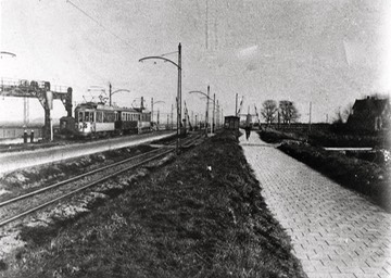 Links de hefbrug van het Haarlemmermeerspoor en de tram die van Amsterdam naar Haarlem reed.