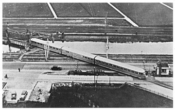 "Een moderne dieseltrein van de Haarlemmermeerspoorlijn (HESM) passeert de hefbrug (Meerspoorbrug) over de Amsterdamsevaart en rijdt richting station (halte) 'Rijksstraatweg'. foto: archief Cor Wies”.