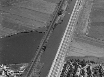 Detail van de vorige foto. Spoorhuis 7 bovenaan in het midden. Het pontje vaart net over.